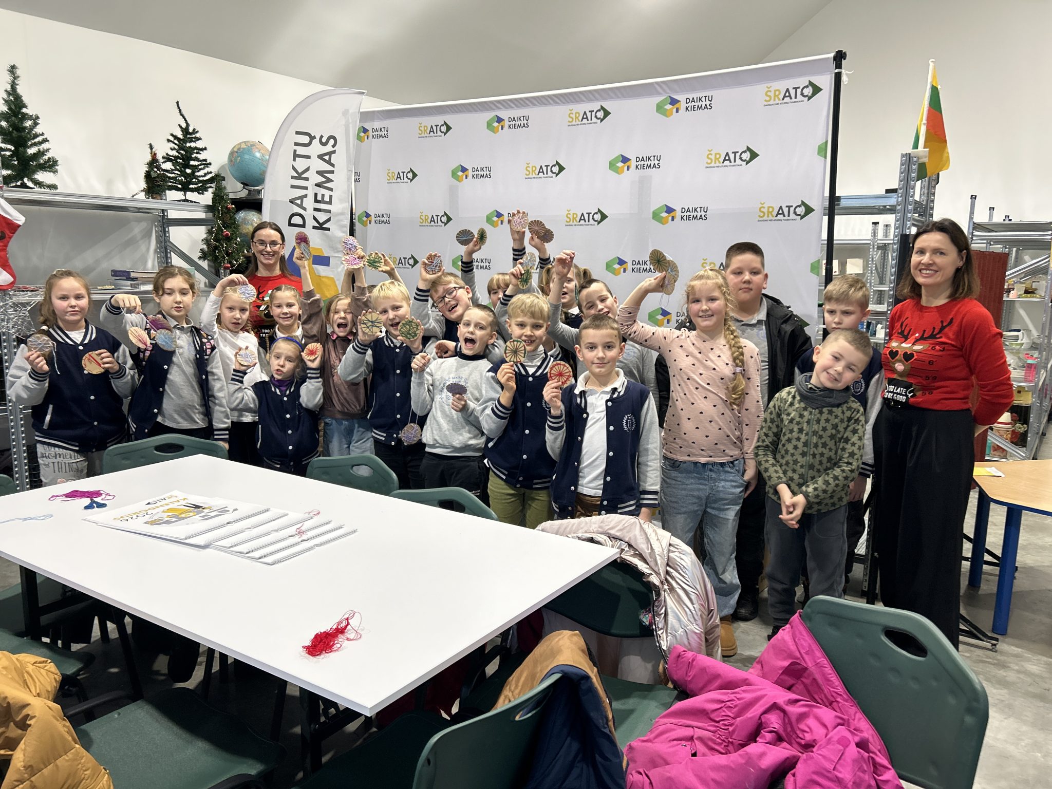 Po edukacijos vaikai dalyvavo kūrybinėse dirbtuvėse, kurių metu iš kartono ir siūlų likučių gamino žaisliukus savo eglutei papuošti. Veikla mažuosius taip įtraukė, kad kiekvienas pasidarė po kelias dekoracijas.