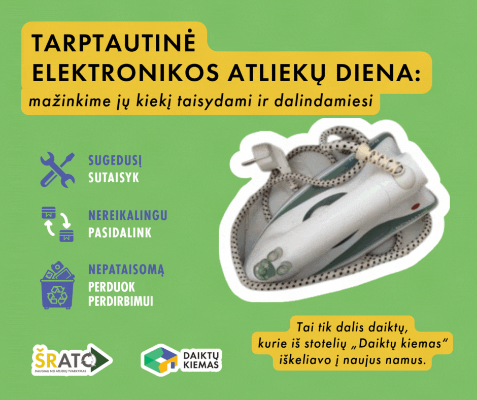 Spalio 14-ąją minint Tarptautinę elektronikos atliekų dieną svarbu kalbėti ne tik apie tinkamą elektronikos atliekų tvarkymą, bet ir apie tai, kaip mažinti jų susidarymą. Vienas paprasčiausių būdų – pratęsti prietaisų naudojimo laiką: sugedusią elektroniką taisyti, o veikiančiais, bet nebereikalingais prietaisais dalintis su kitais.